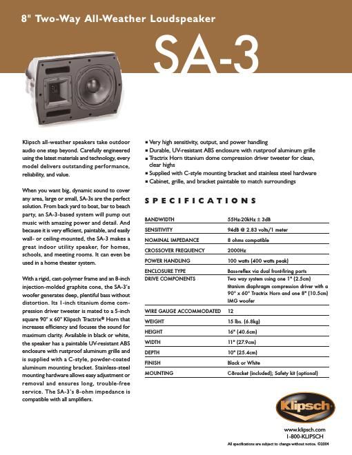 This is the 1 pages manual for klipsch sa 3 brochure.