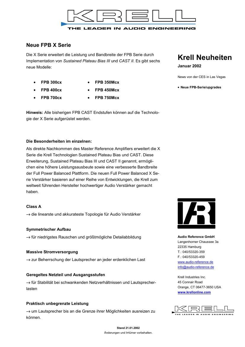 This is the 2 pages manual for krell fpb 300 cx brochure.