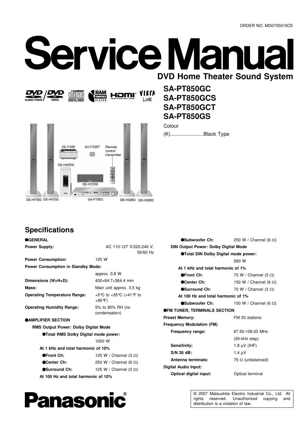 This is the 147 pages manual for panasonic sa pt 850 gc service manual.
