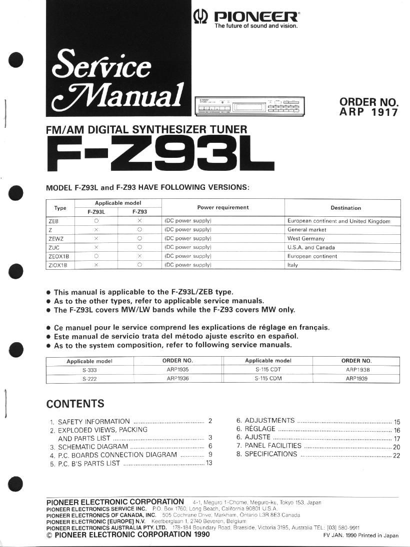 This is the 9 pages manual for pioneer fz 93 l service manual.