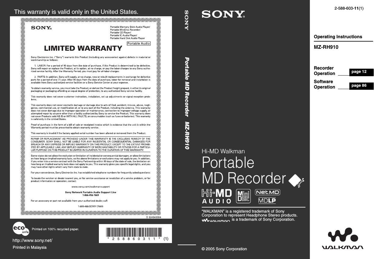 This is the 115 pages manual for sony mz rh 910 owners manual.