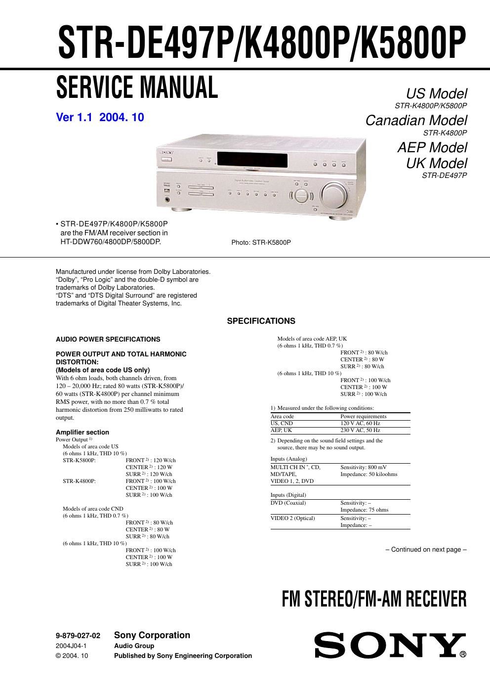 This is the 52 pages manual for sony str de 497p rec service manual.