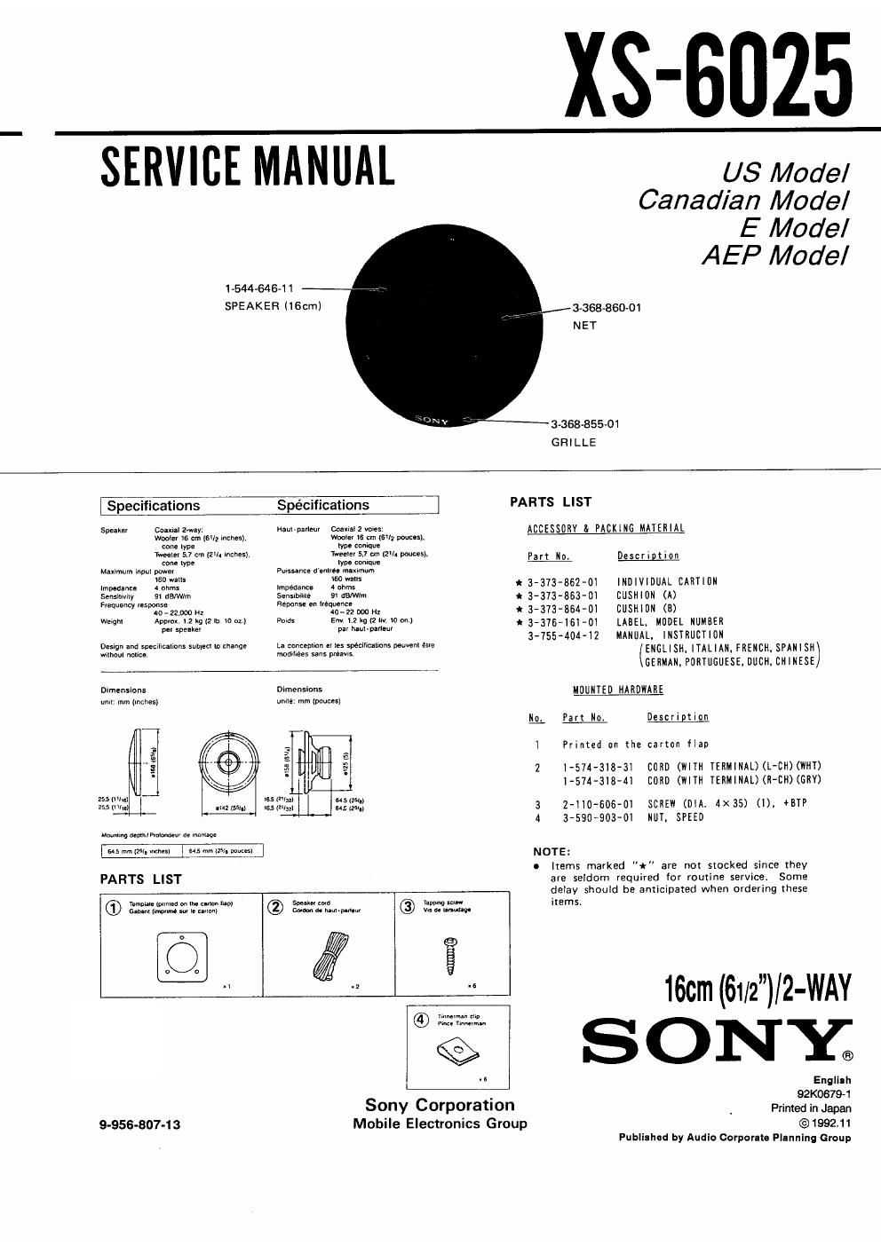 Sony xs 6025 service manual