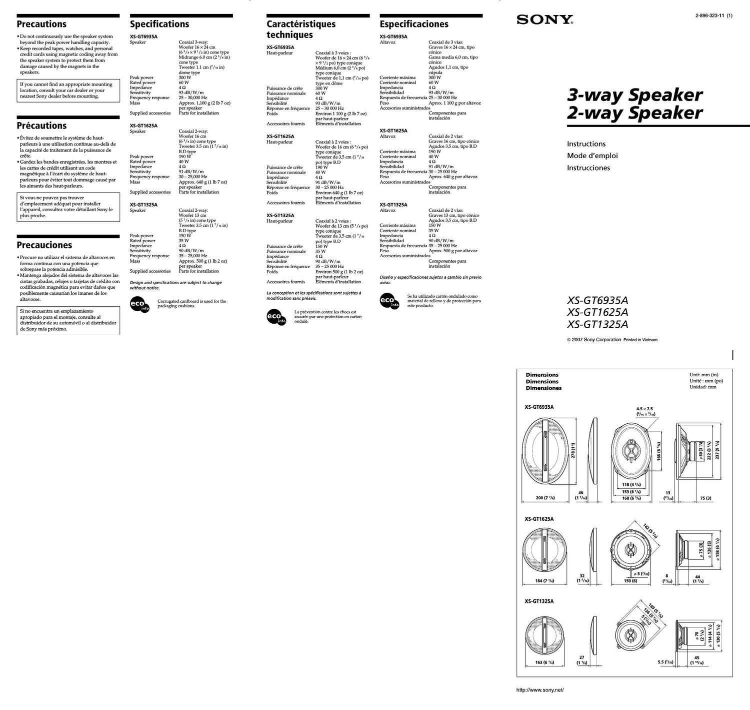 This is the 2 pages manual for sony xs gt 1325 a owners manual.