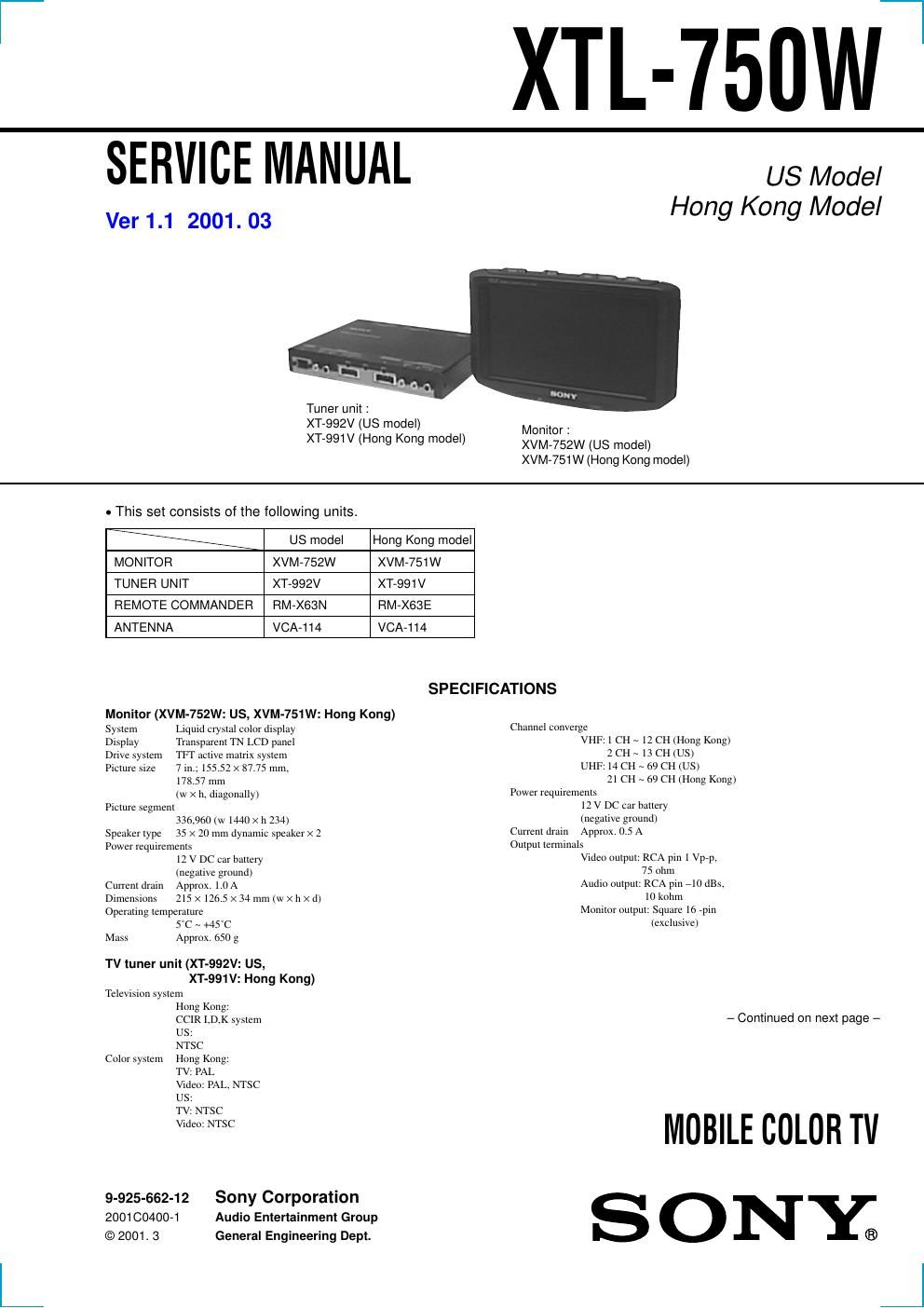 Sony xtl 750 w service manual